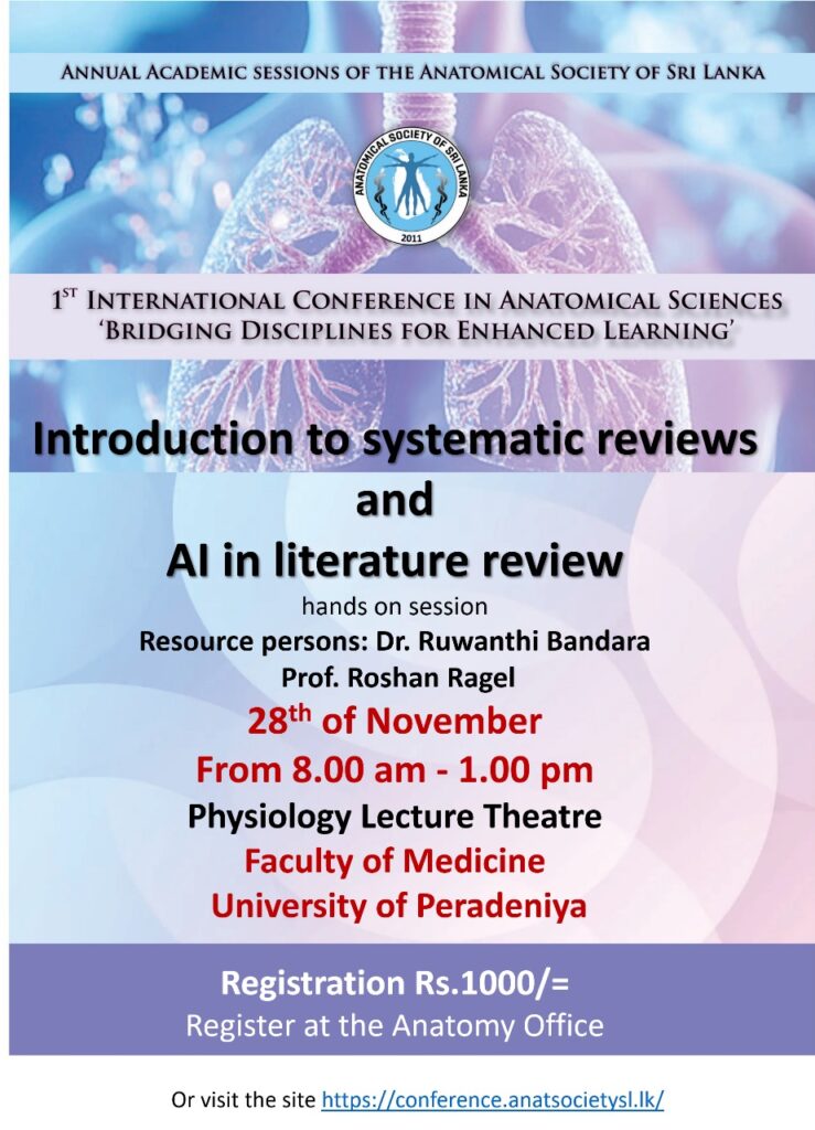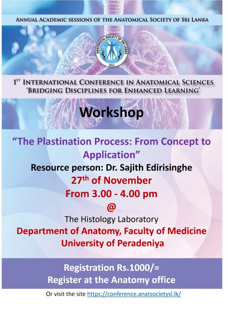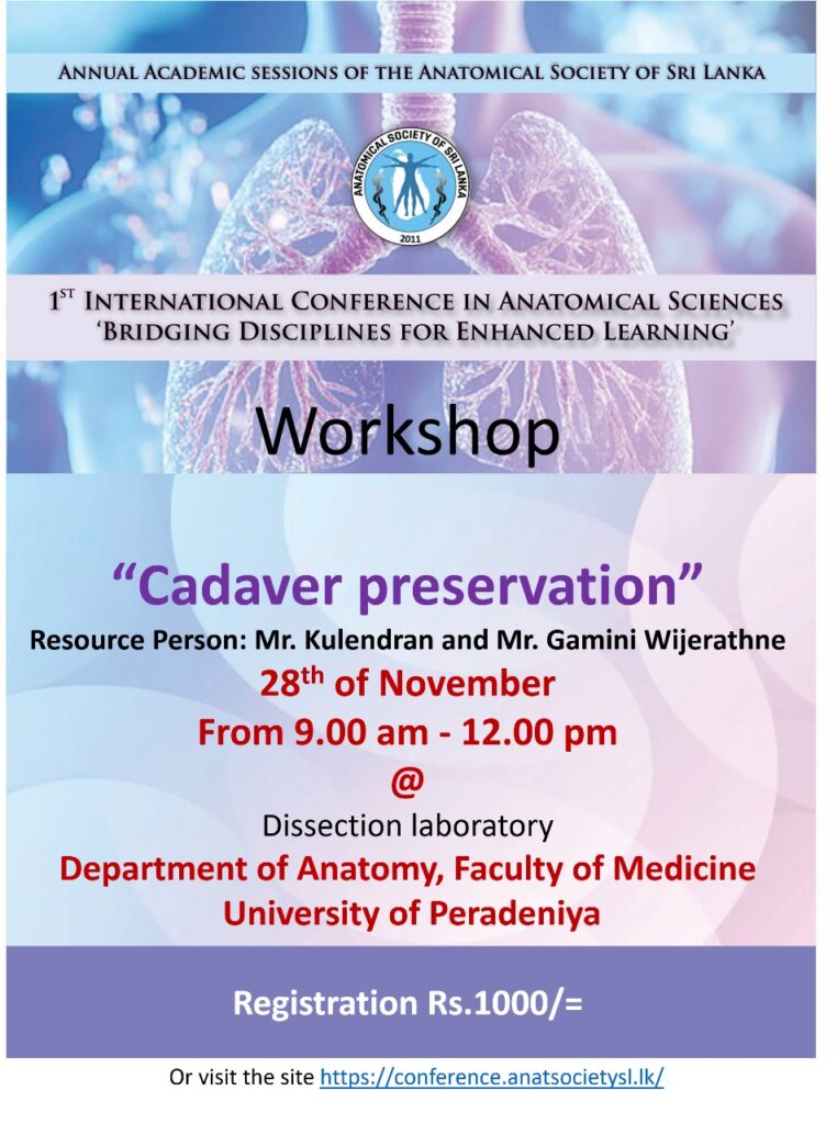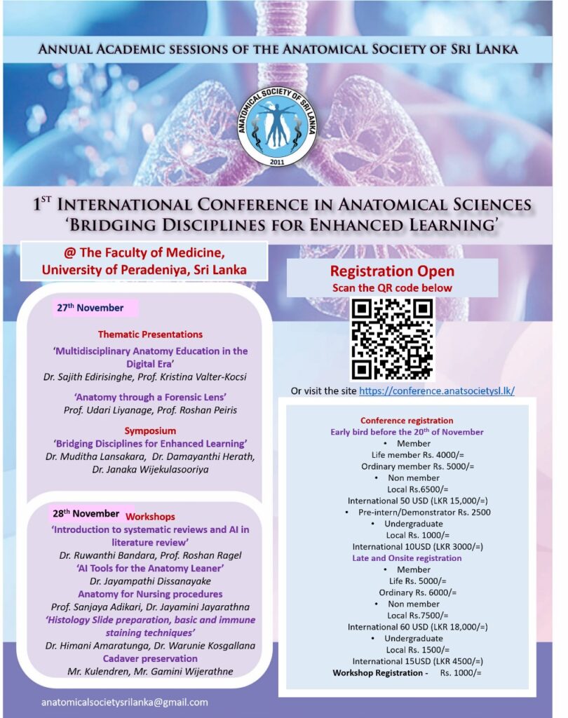 The annual academic sessions of the anatomical society of sri lanka will be held at the Faculty of Medicine University of Peradeniya on the 26th, 27th and 28th of November 2025